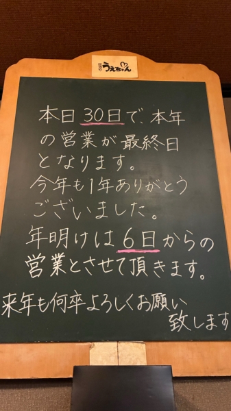 誠に勝手ではございますが、年明けは6日(月)からの営業とさせて頂きますので、何卒ご理解、ご了承の程よろしくお願い致します。